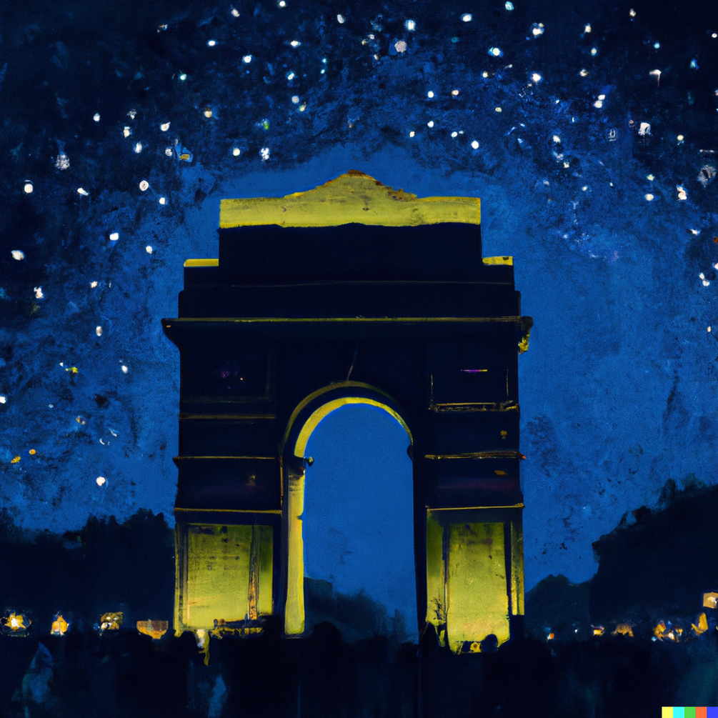 The India Gate, a war memorial archway standing tall amidst lush greenery, is depicted in rich shades of blue, yellow, and orange, resembling a starry night sky. The intricate details of the monument are highlighted by swirling strokes of paint, making it appear as if it is dancing in the wind.